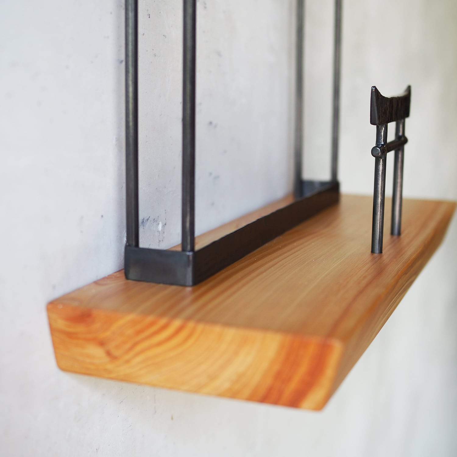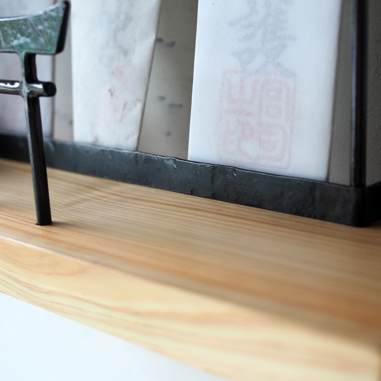 棚板には香り高く美しい、岡山県(主に西粟倉村)のヒノキ無垢材を使用し、鉄と木という異なる素材が美しく調和する神棚に仕上げました。