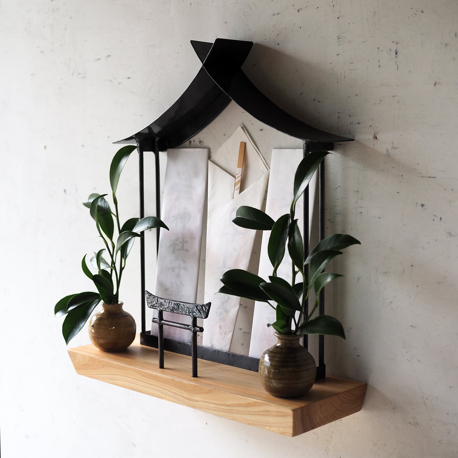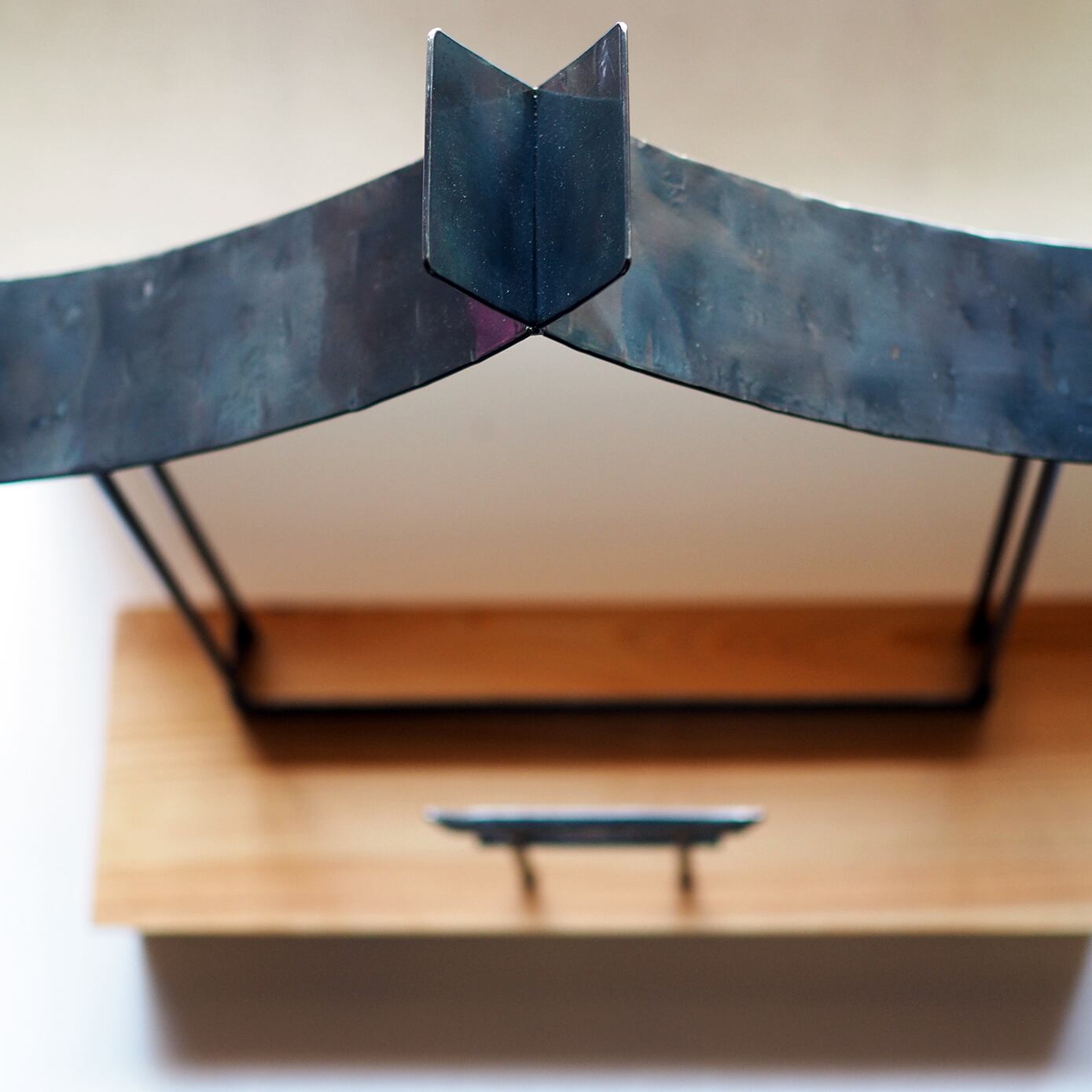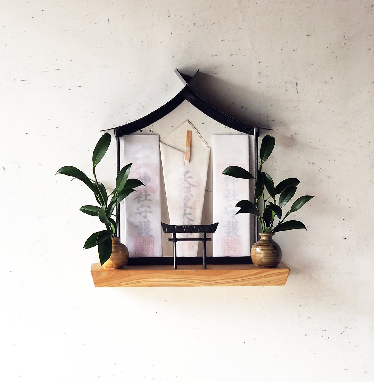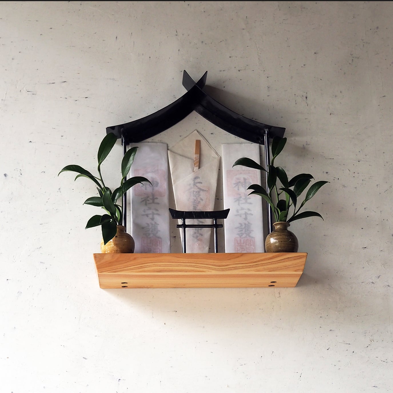 鍛鉄の社(やしろ)と鳥居のアイアンと、無垢材で手仕事で作り上げた、壁掛けタイプの神棚です。