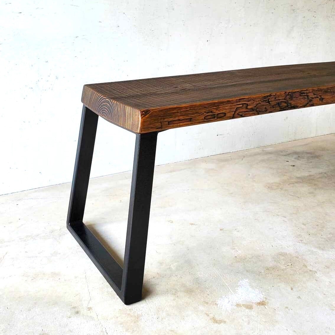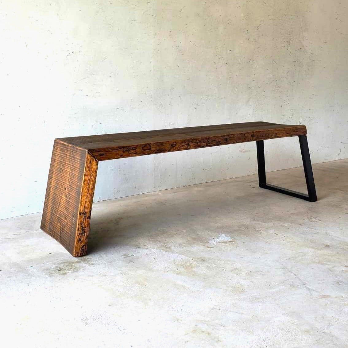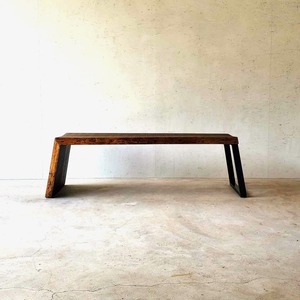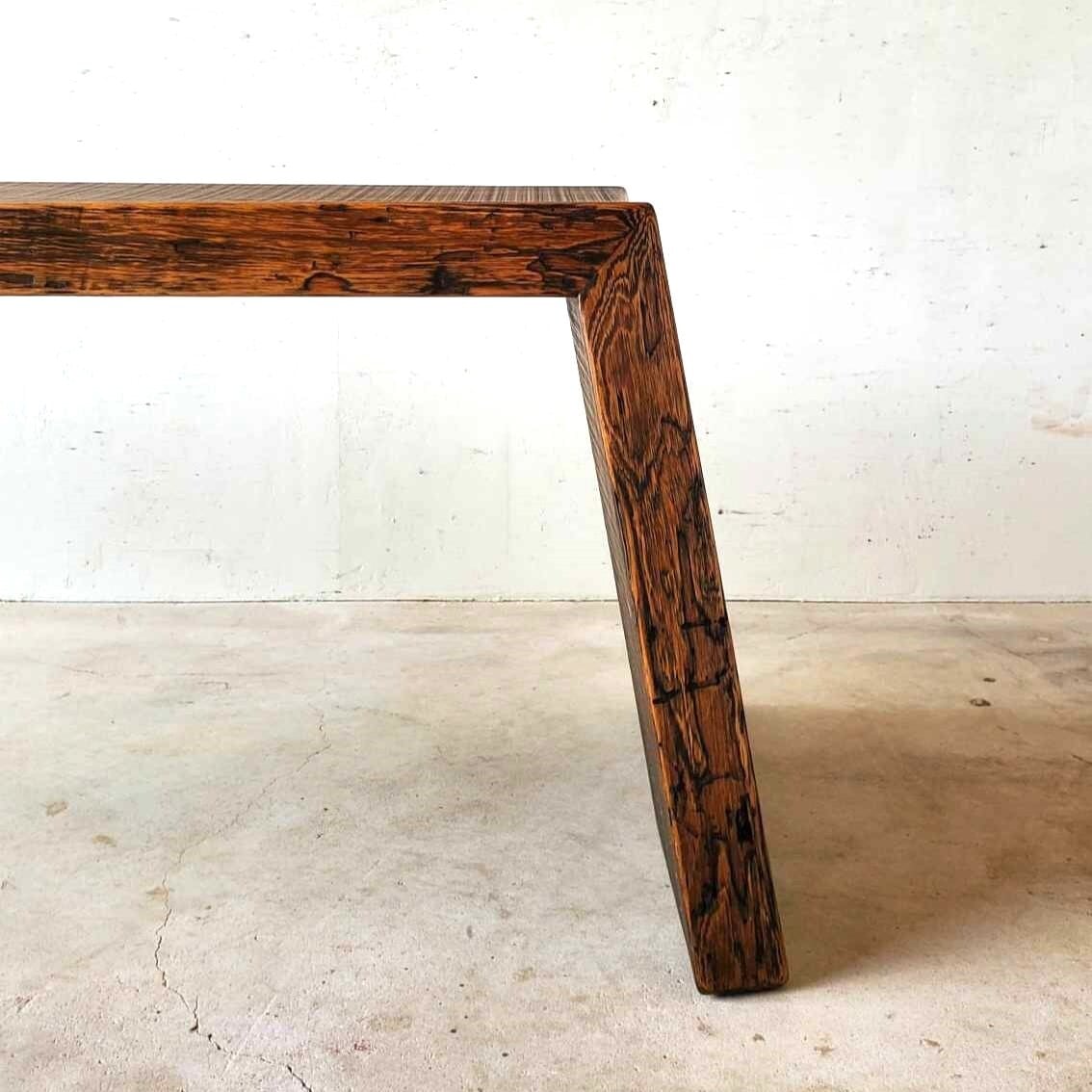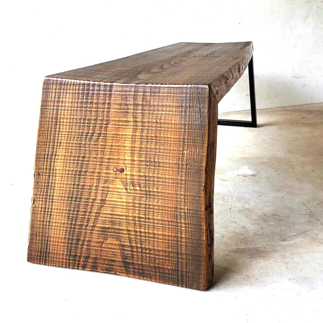 ラフな質感を残した温かみある国産一枚板の赤松の木を使い、「滝」のように天板と脚の木目を繋げたウォーターフォールのデザインに、片側はアイアンのフレームで支えた非対称が絶妙のバランス。