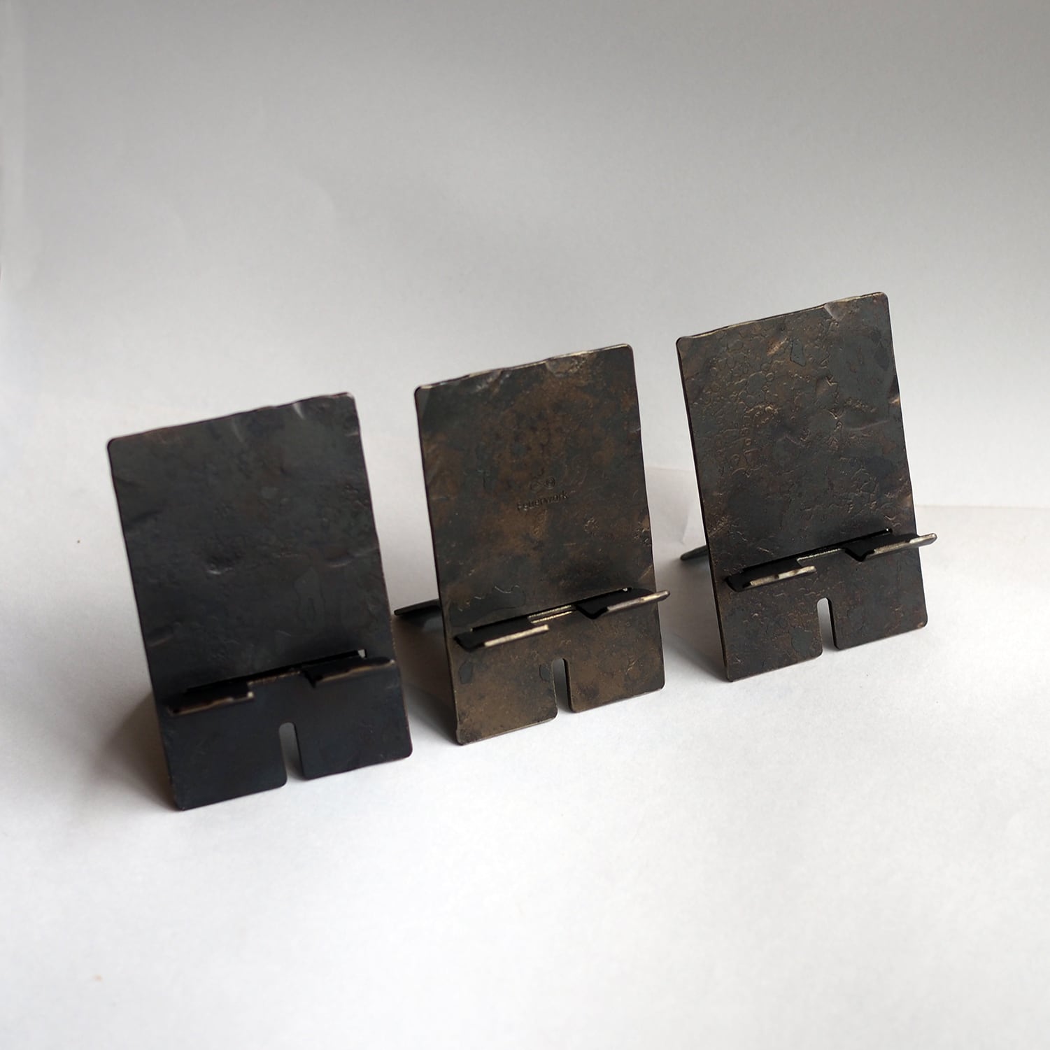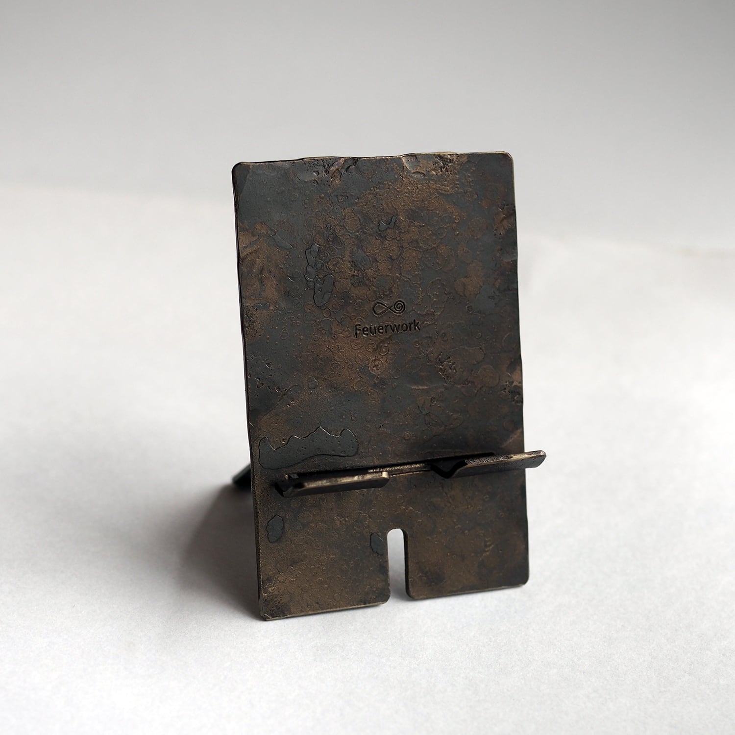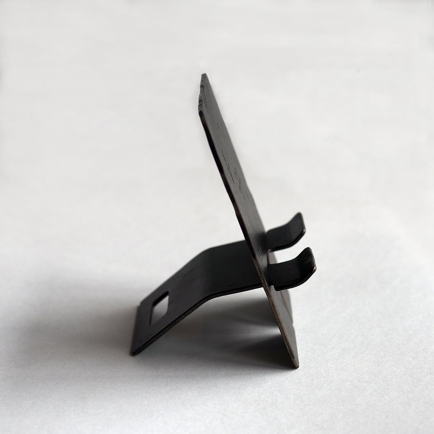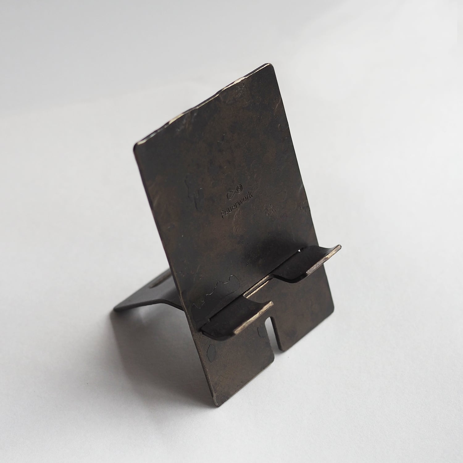 一つひとつ火を入れて浮かび上がる模様や色味と、手作業による槌目が美しいFeuerworkのスマホスタンドは、無駄を削ぎ落としたミニマルなシルエットと、鉄と手仕事の質感の温もり、素材そのものの力強さが魅力です。
